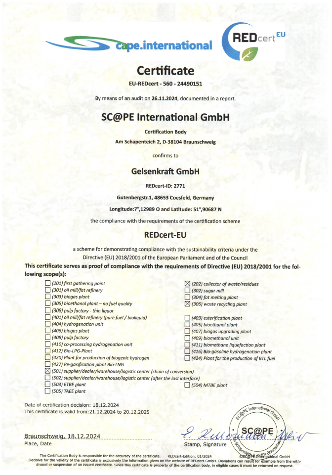 Nos enorgullece anunciar que Gelsenkraft GmbH ha obtenido la certificación oficial del sistema de sostenibilidad REDcert EU.